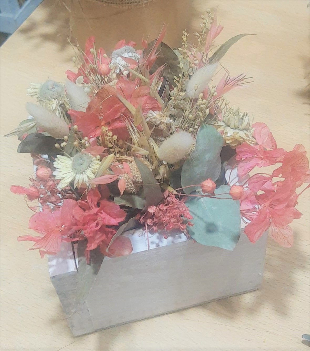 Pequeños tesoros artesanales que combinan madera rústica y flores preservadas en una composición cálida, delicada y duradera.