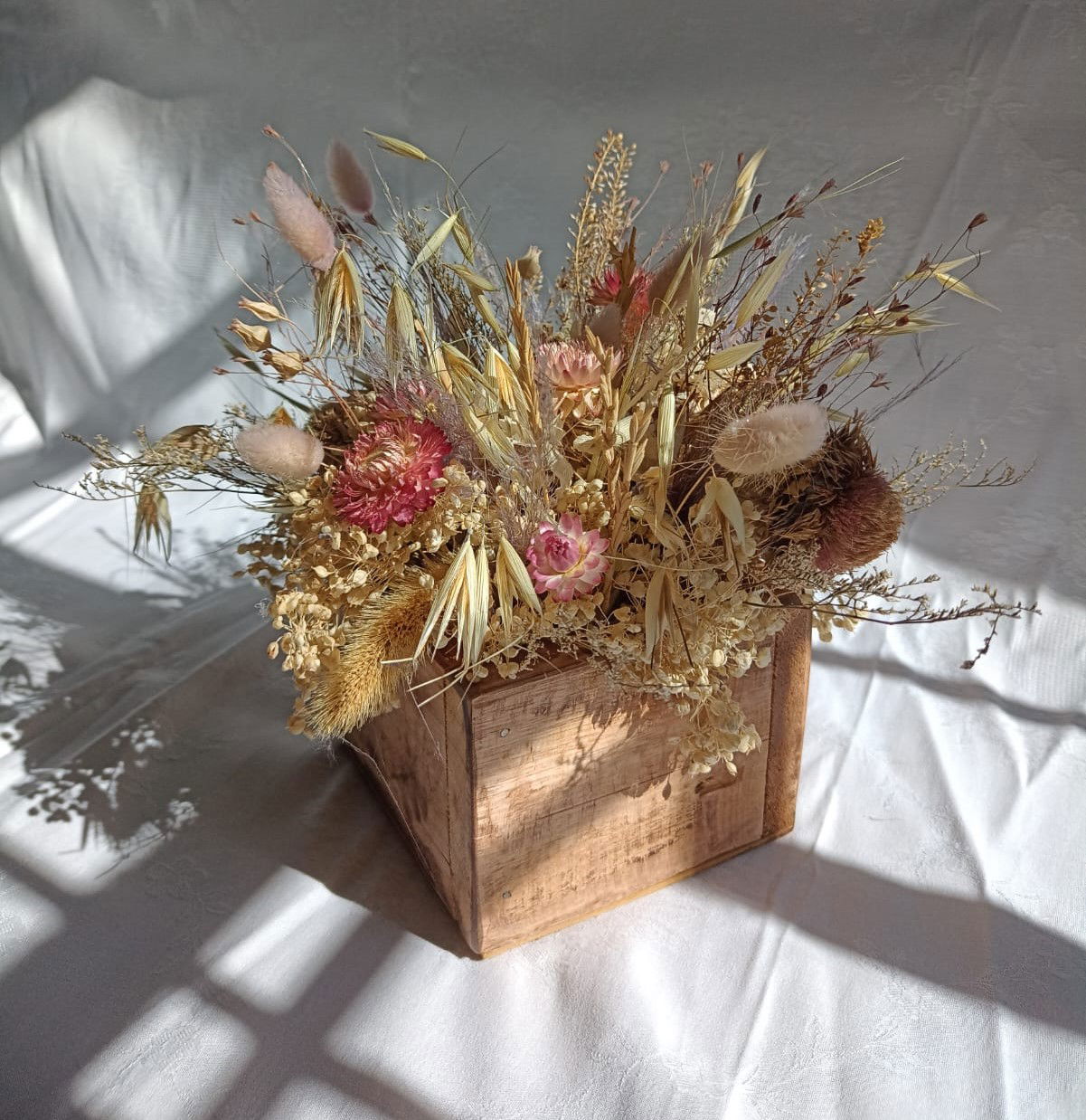 Pequeños tesoros artesanales que combinan madera rústica y flores preservadas en una composición cálida, delicada y duradera.