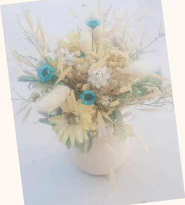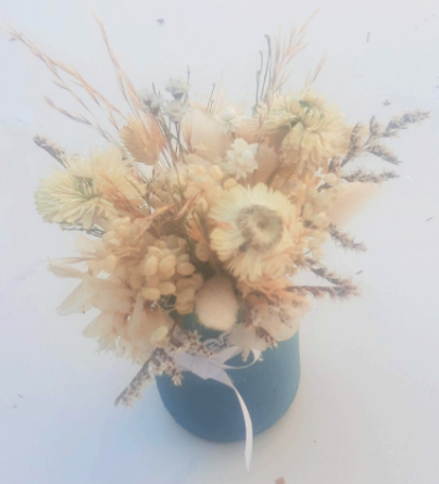 Florero de vidrio + arreglo floral en paleta de colores a elección (según disponibilidad de stock).