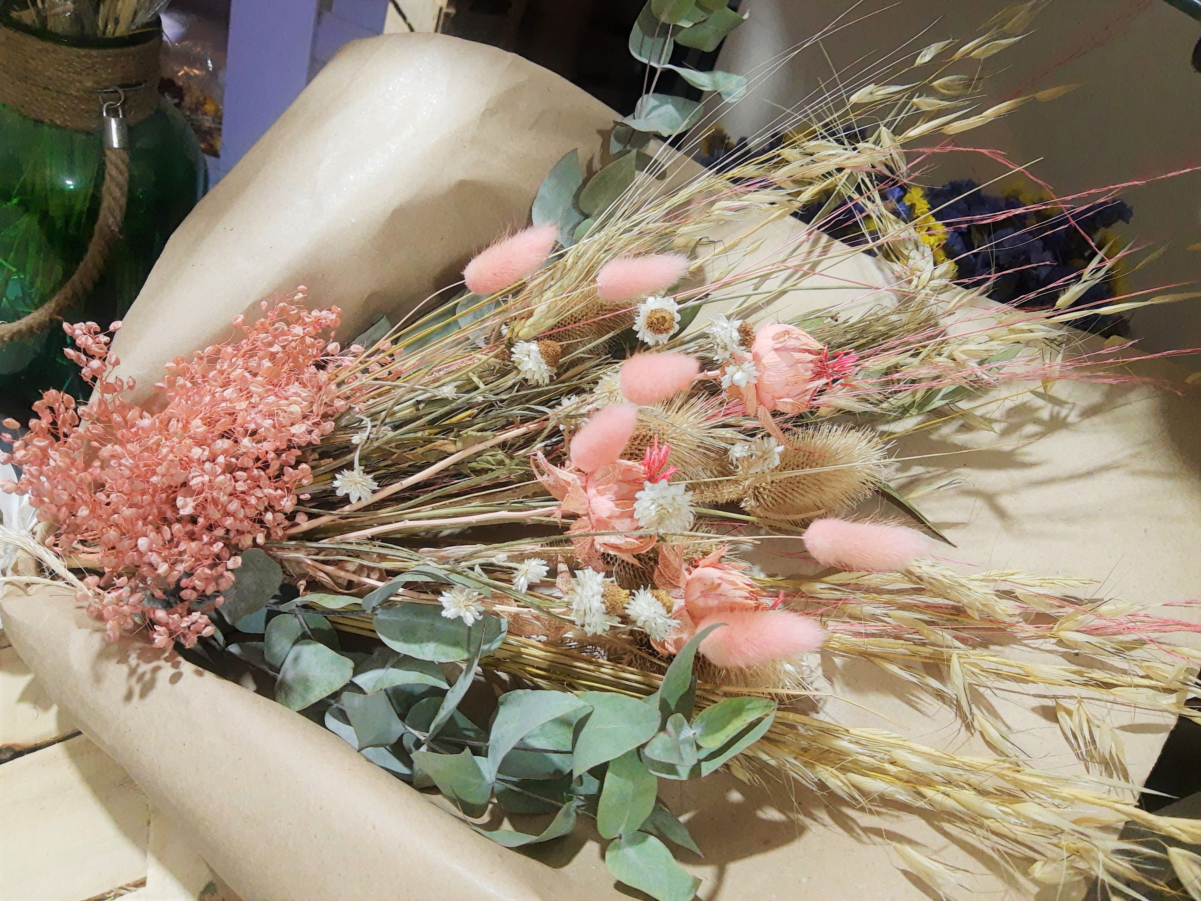 Un arreglo artesanal con espigas, cardos, eucalipto y flores secas en tonos tierra, beige y rosa antiguo. Cada elemento fue elegido por su textura y presencia, creando una composición equilibrada, cálida y con carácter.