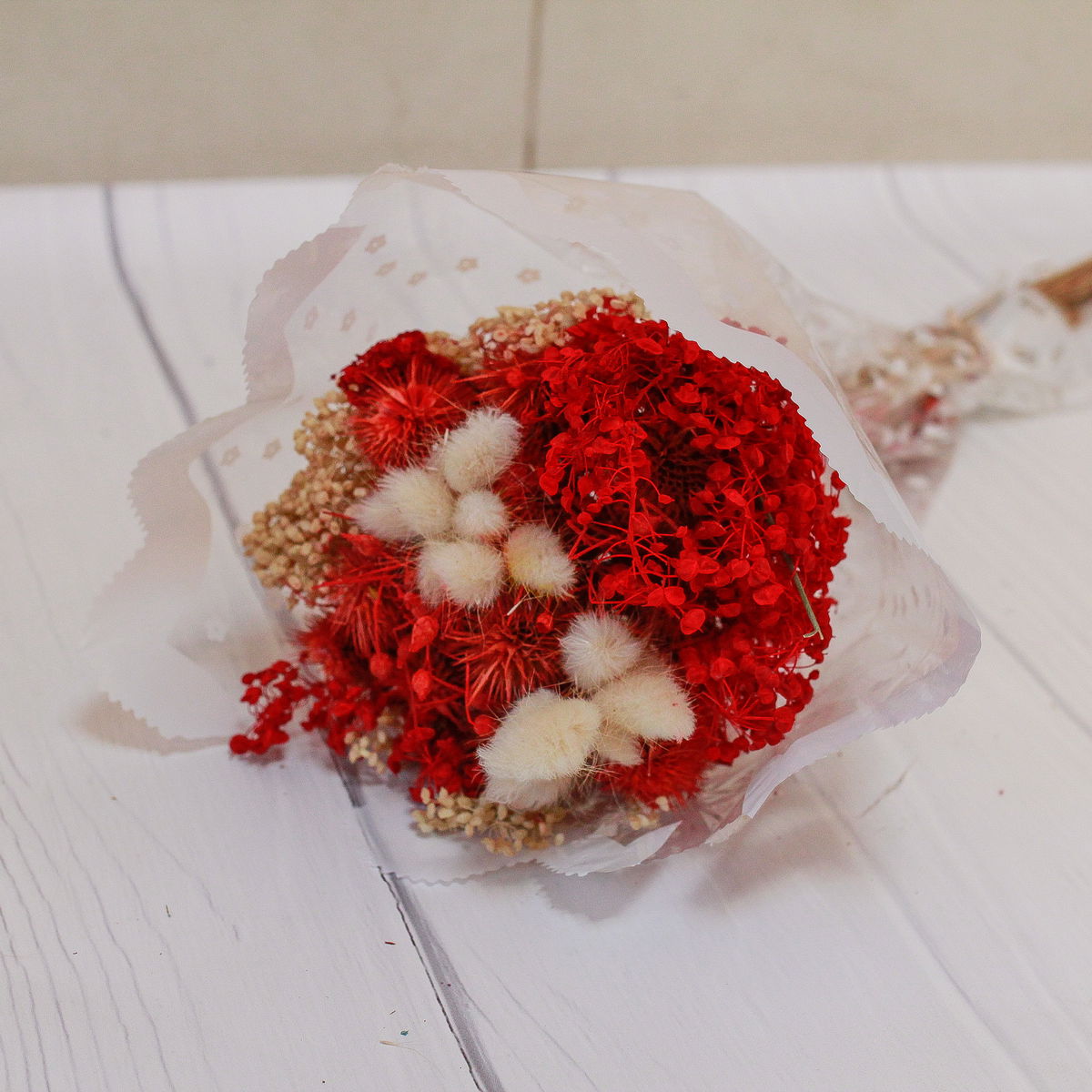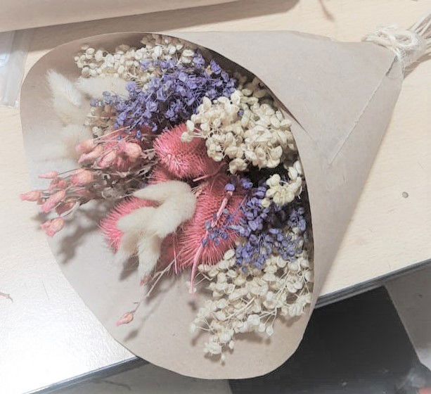 Un bouquet artesanal envuelto en papel kraft, con flores secas en paleta de colores a elección (según disponibilidad de stock). Su composición combina textura, color y delicadeza, evocando el encanto de lo eterno y lo emocional.
